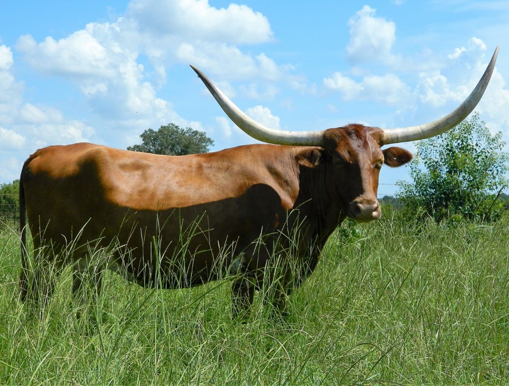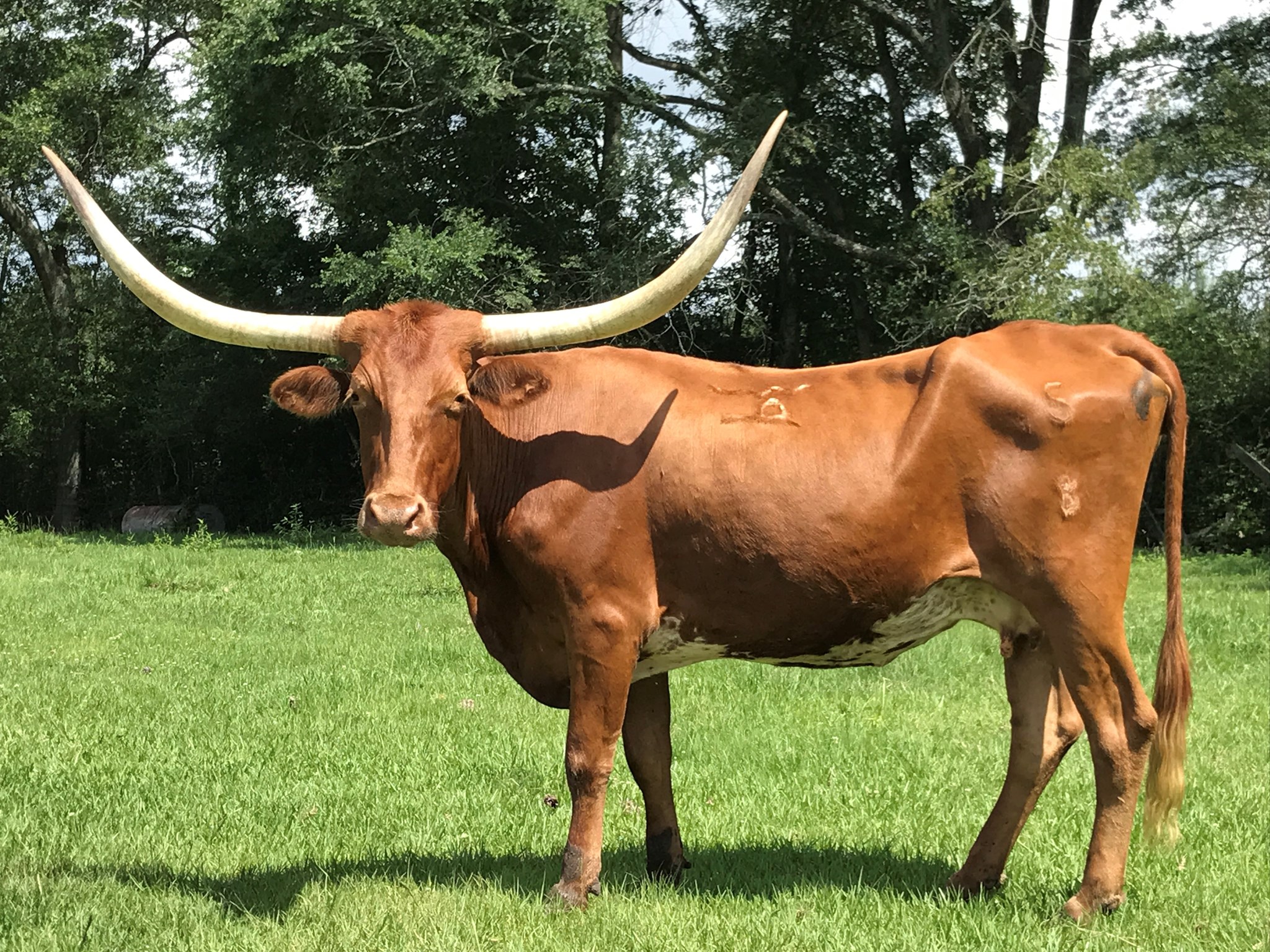 Miss Pixie is a high-horned wonder. She is a heifer producer... knock on wood - I don't want to jinx her! Her heifers are all born white, then roan up beautifully.